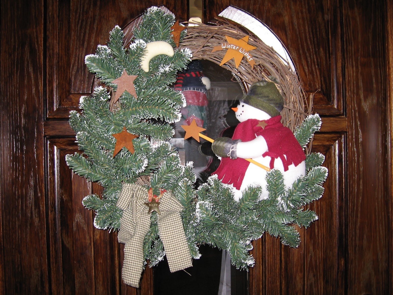 I loved it. I hate nothing more than having snow before or after Christmas and then mud, slush and yuck for the rest of winter. So I have been celebrating winter, as you can see by my wreath, that I refuse to put away. (Over the star it says, "Winter Wishes"). And wearing my favorite winter sweater that says, "Let it snow, Let it snow, Let it snow!". (I have been asked by coworkers to leave it at home. lol!) We currently still have about a foot of snow on our picnic table and a good ten inches on the ground. But the driveway and pathways are clear. We did warm up enough to get some melting and then some new creations appeared.